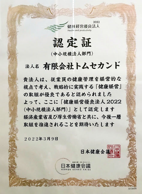 2022.05.01 お知らせ 健康経営優良法人の認定について 経済産業省による健康経営優良法人の認定を頂きましたことをお知らせいたします。従業員の健康管理を経営的な視点で考え、戦略的に取り組んでいる法人として認められることになります。 今後も健康管理について積極的に取り組んでまいります。 次の投稿 102十和田店 開店決定!