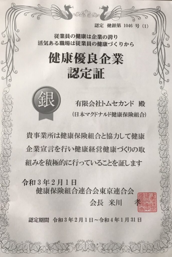 2022.05.02 お知らせ 健康優良企業「銀の認定」ついて 企業全体で健康づくりに取り組むことで認定される健康優良企業の「銀の認定」を健康保険組合連合会から認定されることになりました。 今後も健康づくりをより一層取り組んでまいります。 前の投稿 102十和田店 開店決定! 次の投稿 健康経営優良法人の認定について