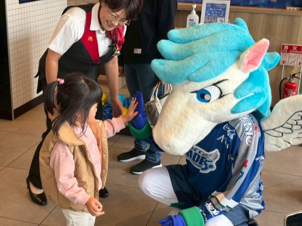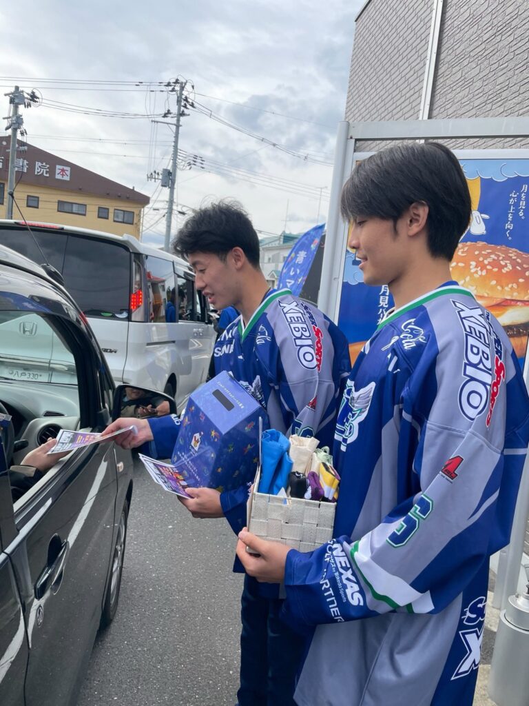 当日は、地元プロアイスホッケーチーム 東北フリーブレイズ の選手の皆さん、そしてチームマスコットキャラクターのブレイジーにもご参加いただき、たくさんのお客様と心温まる交流が生まれました。
