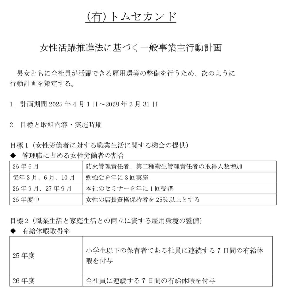 2025.03.21 お知らせ 女性活躍推進法行動計画の更新 「女性活躍推進法に基づく一般事業主行動計画」の更新をしました。 PDFファイルでも公開しています。 前の投稿 健康優良企業「銀の認定」について 次の投稿 ホームページリニューアルのお知らせ